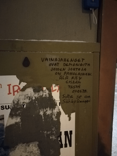 Kävelen usein yhdistyksen Kivijalka-toimitilan ohitse kaupungin keskustassa liikkuessani. Viimeksi näin tehdessäni huomioni kiinnittyi sen sisäänkäynnin vieressä olevaan sähkökaappiin, johon oli kirjoitettu mustalla tussilla: ”Vainajahenget ovat demoneita joiden johtaja on paholainen. Älä käy sisään tästä ovesta.” Kirjoittaja oli epäilemättä tarkoittanut Kivijalan ovea, mutta joku koiranleuka oli ehättänyt tulkitsemaan asian toisin kirjoittamalla tekstin alle selventävän kommentin: ”Sillä se on sähkökaappi.”