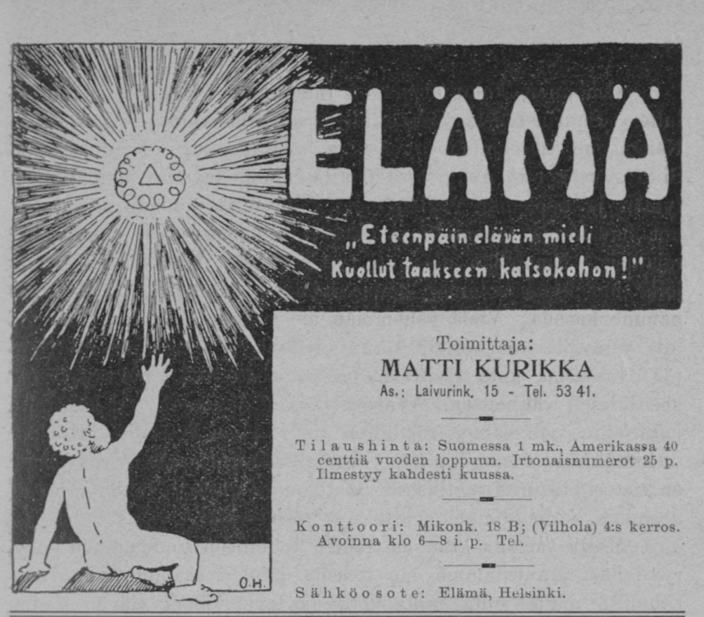 Elämä oli alusta asti ollut täynnä teosofiaan ja muihin esoteerisiin liikkeisiin ja aatteisiin viittaavia tekstejä. Nyt tämä salatieteellinen painotus nostettiin myös sen etusivun kuvitukseen. Matti Kurikka selitti Heinon teoksen symboliikkaa osana pitkää ja moniosaista kirjoitustaan ’Mikä on ”Elämän” ohjelma?’ (Elämä 1-5/1907). Kirjoituksen toisessa osassa hän kiinnitti lukijan huomion otsikon ”salaperäiseen kuvaan”, jossa ”ajan pimeyteen tunkeutuvasta valosta näkyy kolmikulmio, jota piirittää loppumattomaksi spiraaliksi (”perpetual spiral”) muodostunut ympyrä”. Näillä ”vertauskuvilla” hän totesi lehden ulosantajien tahtovan ”silmin-näkyvässä muodossa ilmaista sen, mistä ohjelmamme alkaa, s. o. mille kaikki tietomme elämästä nojaa.” Esitellessään Elämän ”ohjelmaa” Kurikka ei esitellytkään vain lehden aatteellisia tai yhteiskunnallisia tavoitteita, vaan pureutui koko okkulttisen elämänymmärryksen itsensä metafyysiseen perustaan.