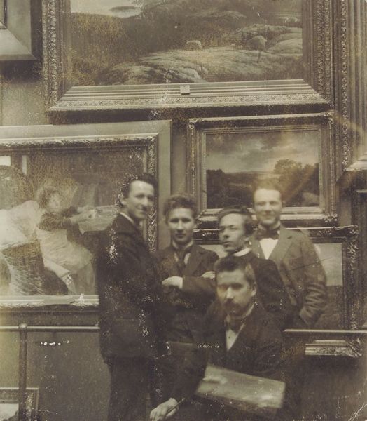 ”Suomen Taideyhdistyksen piirustuskoulun oppilaita Ateneumin näyttelytiloissa n. 1900. Edessä Bruno Pakarinen, Pakarisen takana Valfrid Kauhanen, oikealla Vihtori Ylinen, keskellä Onni Heino (?), vasemmalla Viktor Svaetichin.